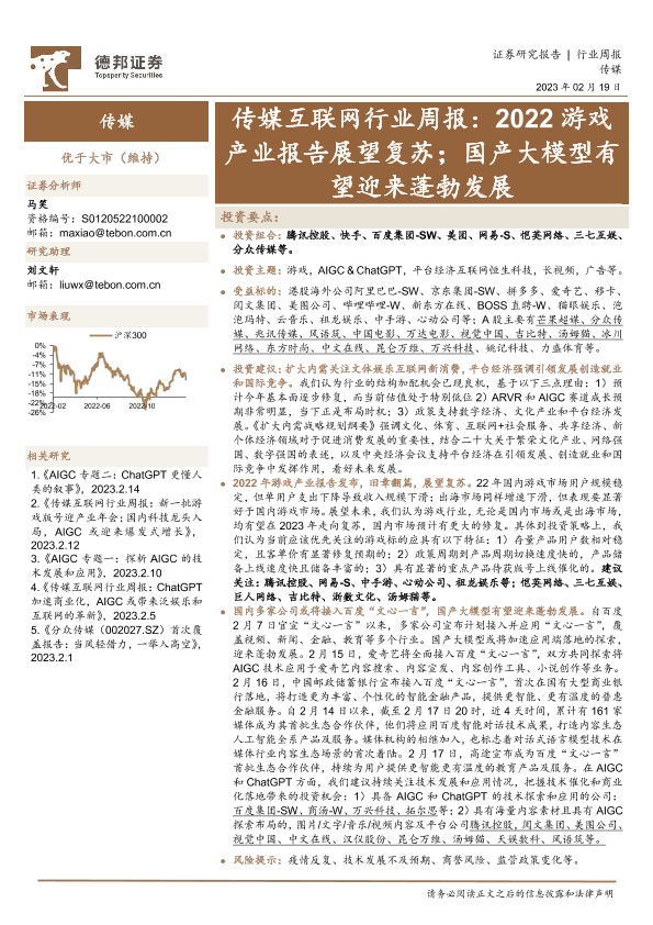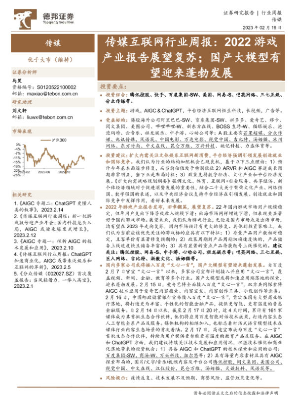 【德邦证券】【20230219】传媒互联网行业周报:2022游戏产业报告展望复苏;国产大模型有望迎来蓬勃发展-16页