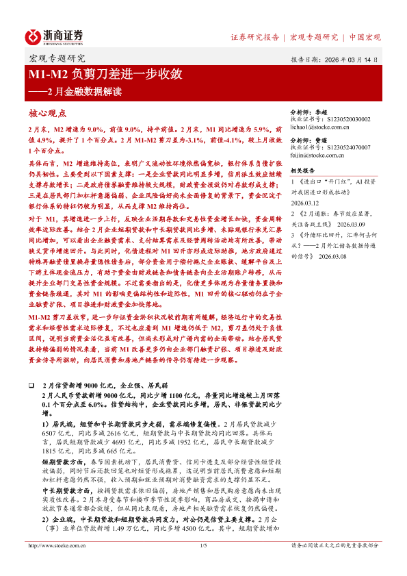 【浙商证券】【202603】M1-M2负剪刀差进一步收敛——2月金融数据解读-5页