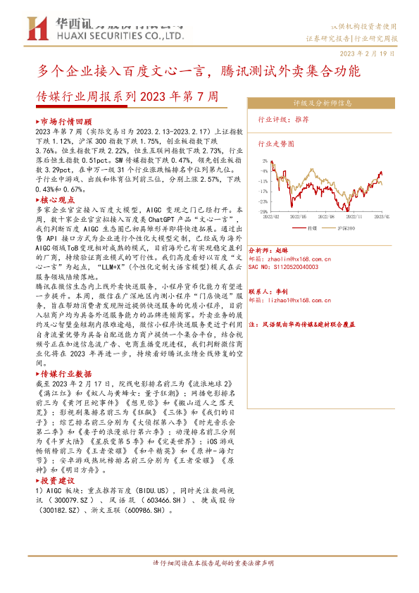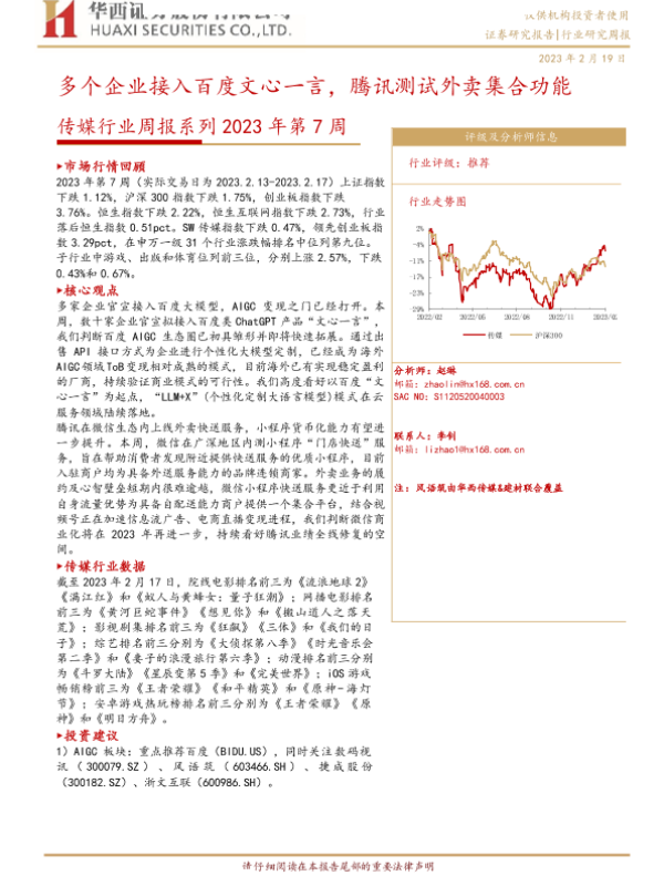 【华西证券】【20230219】传媒行业周报系列2023年第7周:多个企业接入百度文心一言,腾讯测试外卖集合功能-37页