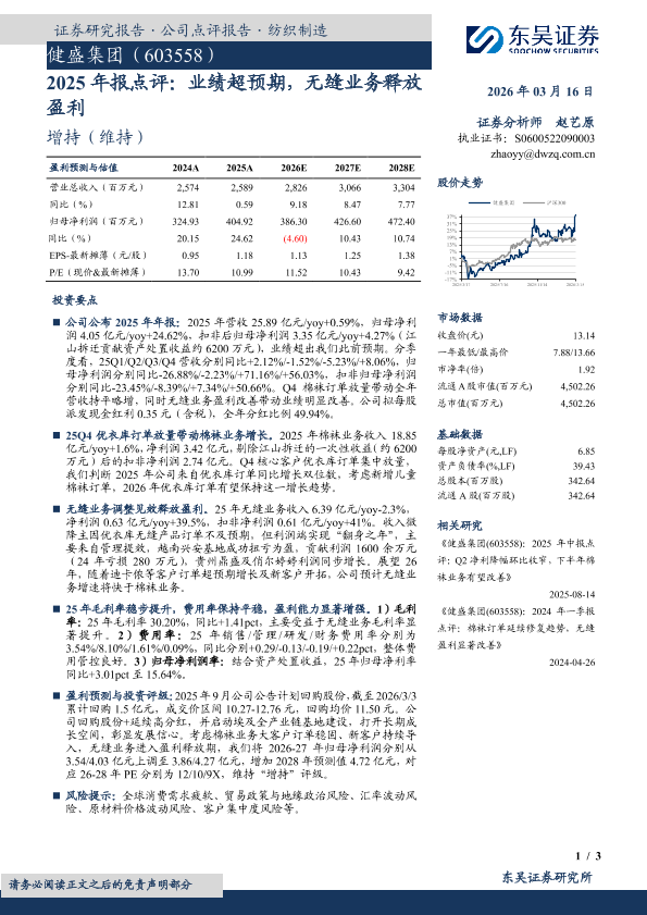 无缝业务 盈利改善 棉袜业务 高分红 业绩超预期