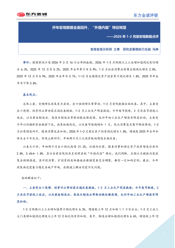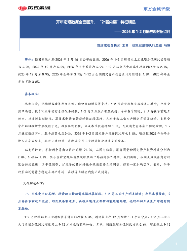 【东方金诚评级】【202603】2026年1-2月度宏观数据点评:开年宏观数据全面回升,“外强内弱”特征明显-5页