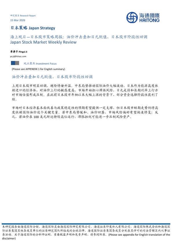 【海通国际】【202603】海上观日—日本股市策略周报:油价冲击叠加日元贬值,日本股市阶段性回调-12页