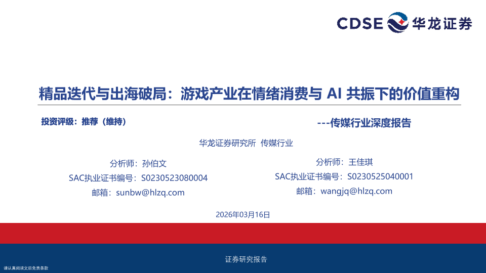 【华龙证券】【202603】精品迭代与出海破局:游戏产业在情绪消费与AI共振下的价值重构-22页