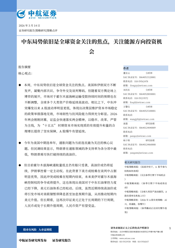 【中航证券】【202603】中东局势依旧是全球资金关注的焦点,关注能源方向投资机会-9页