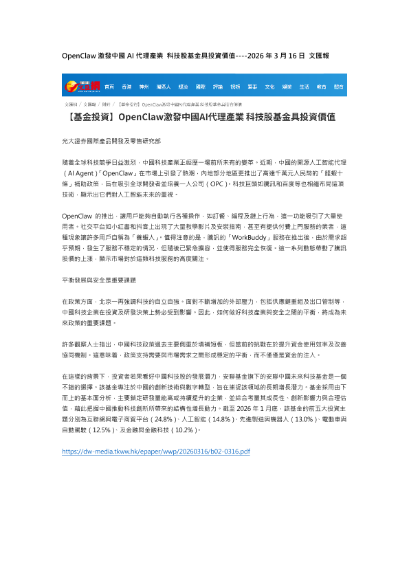 【光大证券国际】【202603】OpenClaw激發中國 AI代理產業科技股基金具投資價值-1页