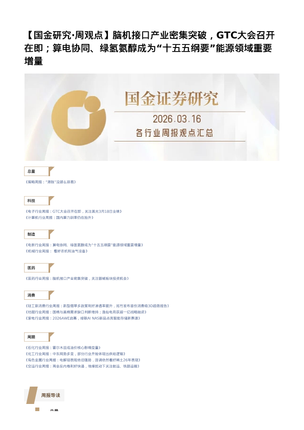 【国金证券】【202603】脑机接口产业密集突破,GTC大会召开在即;算电协同、绿氢氨醇成为“十五五纲要”能源领域重要增量-5页
