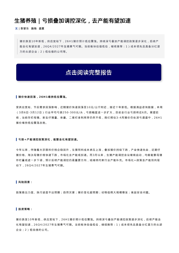去产能 亏损 产能调控 生猪养殖 投资策略