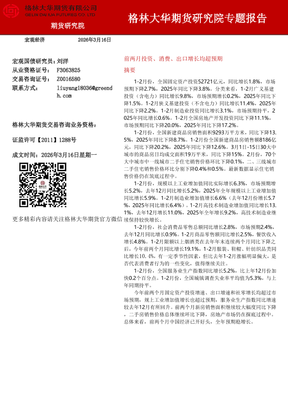 【格林大华期货研究院】【202603】前两月投资、消费、出口增长均超预期-6页