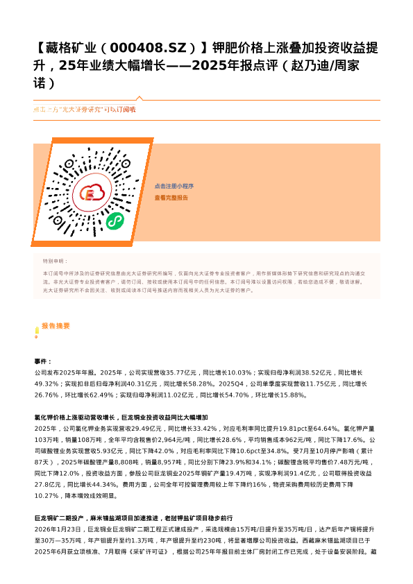 【光大证券】【202603】【藏格矿业(000408.SZ)】钾肥价格上涨叠加投资收益提升,25年业绩大幅增长——2025年报点评-2页