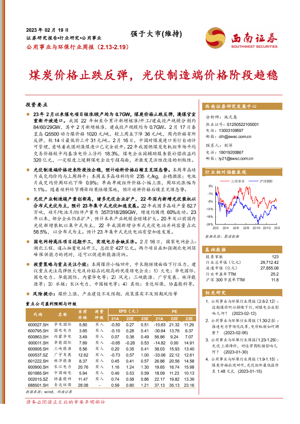 【西南证券】【20230219】公用事业与环保行业周报:煤炭价格止跌反弹,光伏制造端价格阶段趋稳-21页