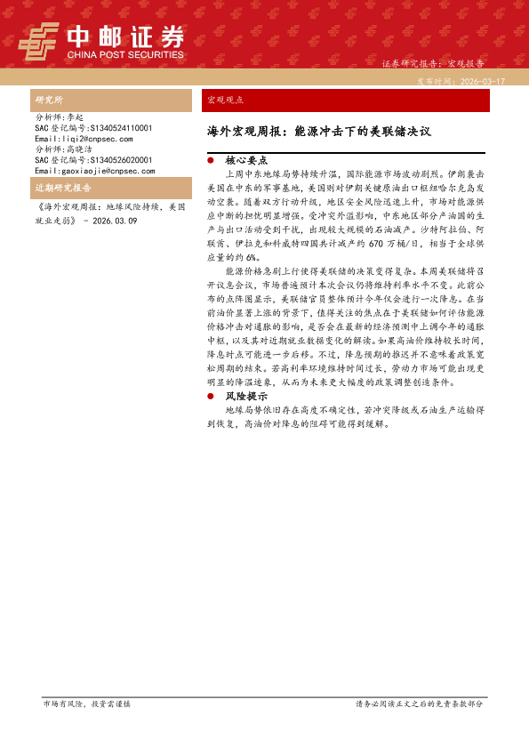 【中邮证券】【202603】海外宏观周报:能源冲击下的美联储决议-10页