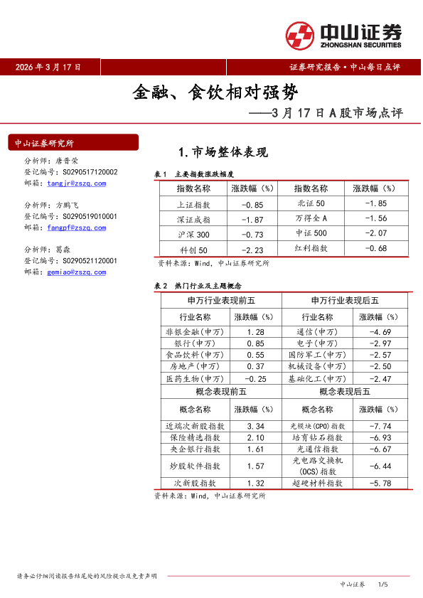【中山证券】【202603】金融、食饮相对强势——3月17日A股市场点评-5页