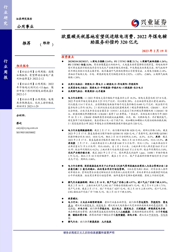 【兴业证券】【20230219】公用事业行业周报:欧盟碳关税落地有望促进绿电消费,2022年煤电辅助服务补偿约320亿元-24页