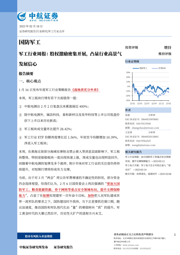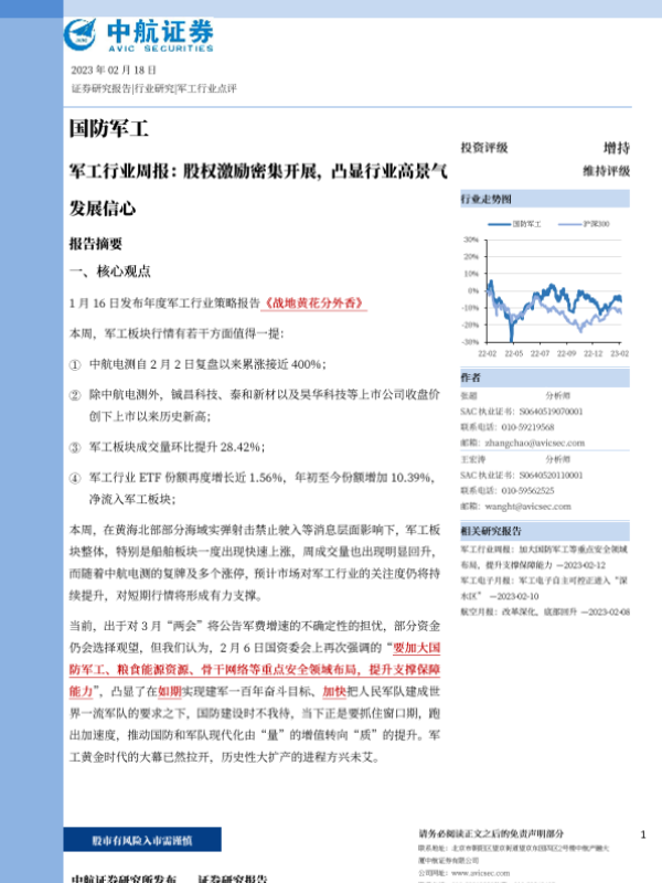 【中航证券】【20230218】军工行业周报:股权激励密集开展,凸显行业高景气发展信心-64页
