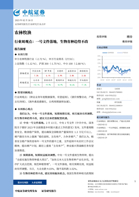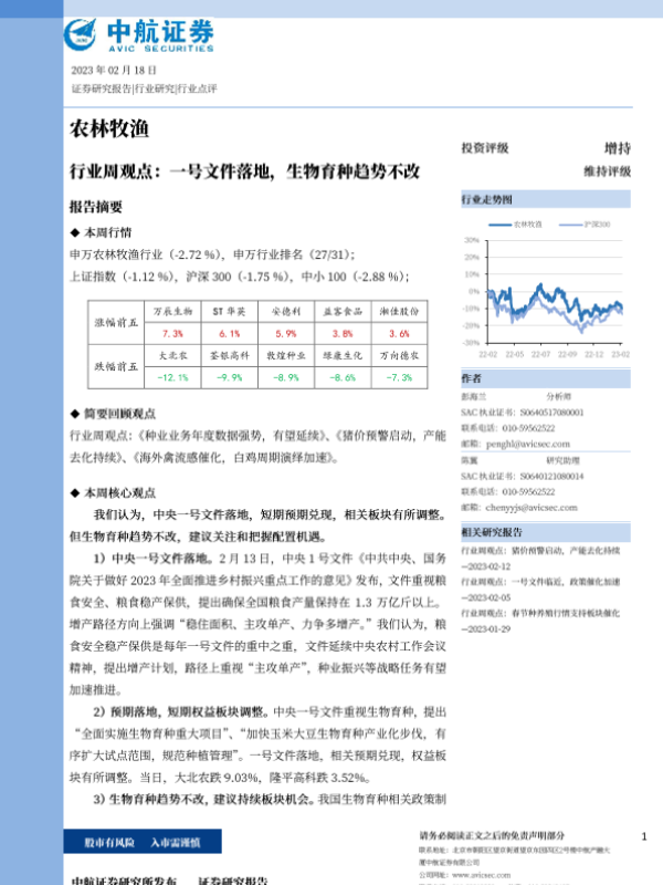 【中航证券】【20230218】农林牧渔行业周观点:一号文件落地,生物育种超势不改-14页