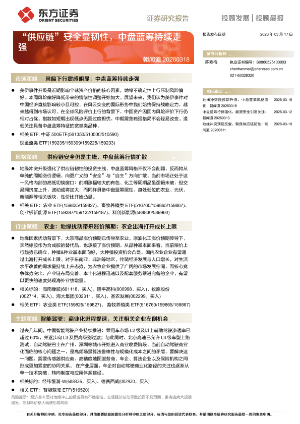 供应链安全 智能驾驶 农业投资 地缘冲突 中盘蓝筹