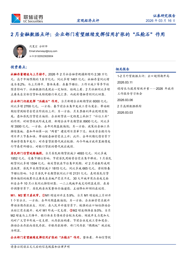 【联储证券】【202603】2月金融数据点评:企业部门有望继续发挥信用扩张的“压舱石”作用-10页