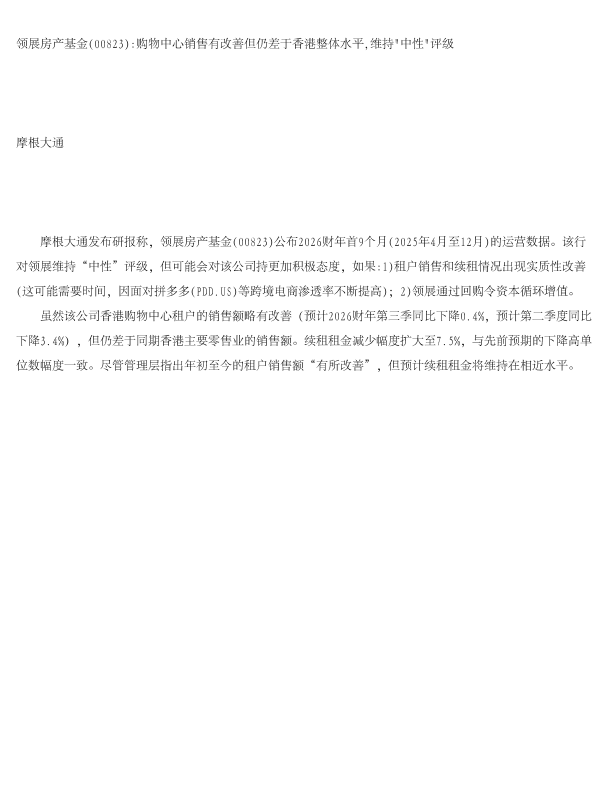 【J.P. Morgan】【2026】领展房产基金(00823) 购物中心销售有改善但仍差于香港整体水平,维持"中性"评级-1页