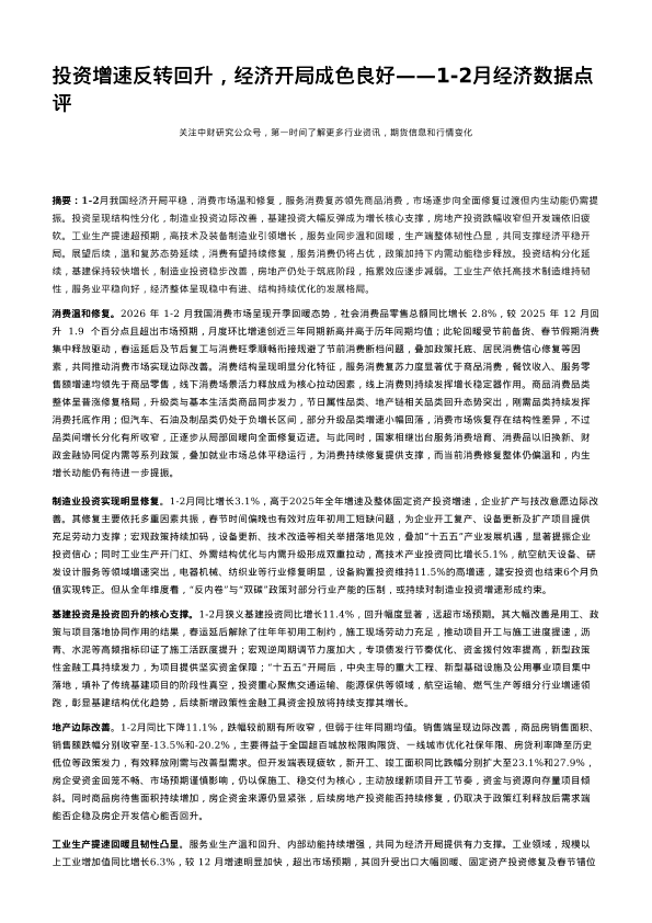 【中财期货交易咨询总部】【202602】投资增速反转回升,经济开局成色良好——1-2月经济数据点评-4页