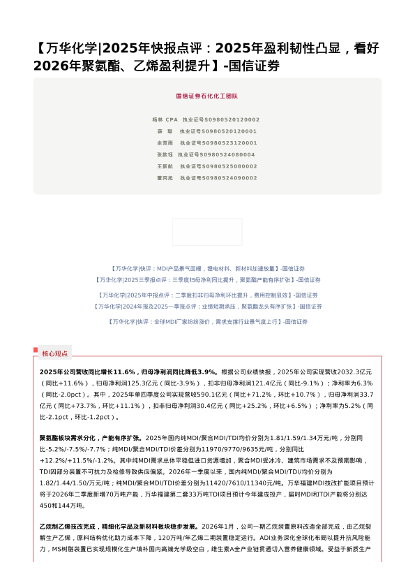 【国信证券】【2025】万华化学_2025年快报点评_2025年盈利韧性凸显,看好2026年聚氨酯、乙烯盈利提升-6页