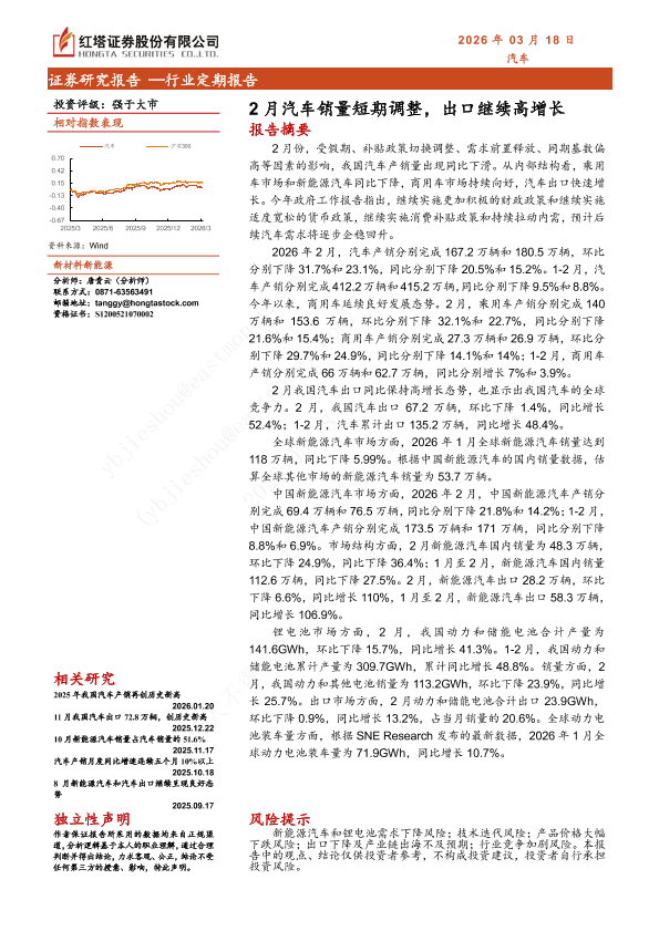 【红塔证券】【202603】2月汽车销量短期调整,出口继续高增长-19页