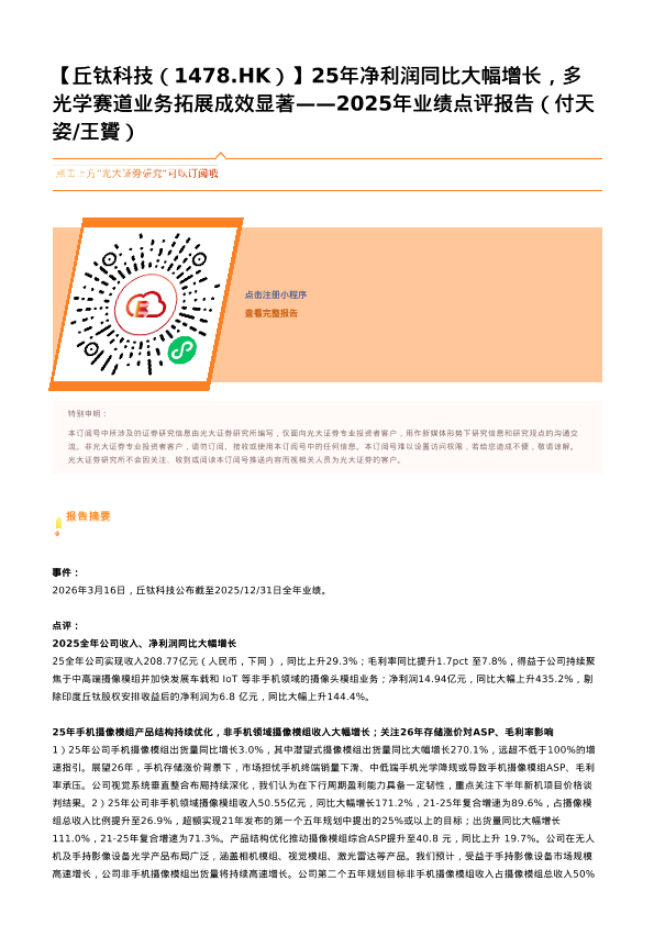 【光大证券】【2026】【丘钛科技(1478.HK)】25年净利润同比大幅增长,多光学赛道业务拓展成效显著——2025年业绩点评-2页