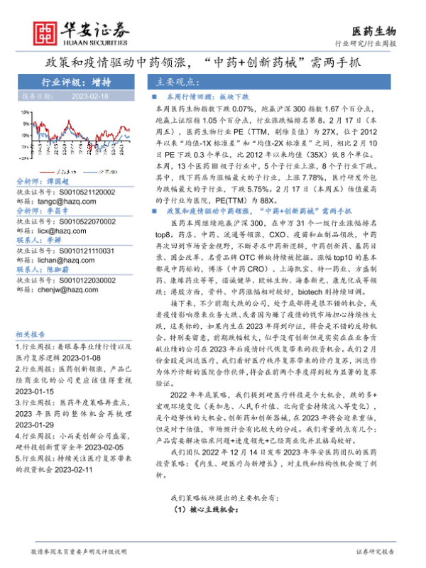 【华安证券】【20230218】医药生物行业周报:政策和疫情驱动中药领涨,“中药+创新药械”需两手抓-16页