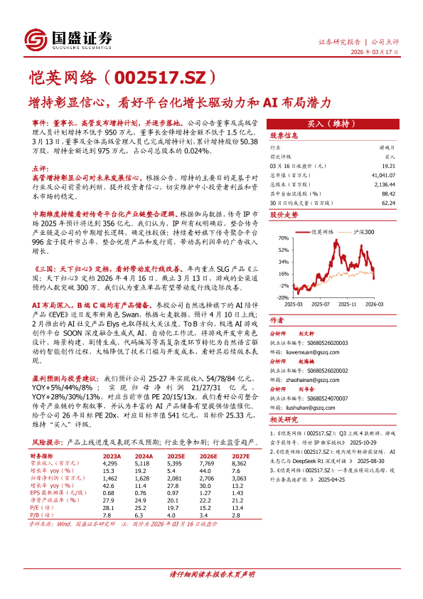 恺英网络 增持计划 传奇IP AI布局 游戏行业