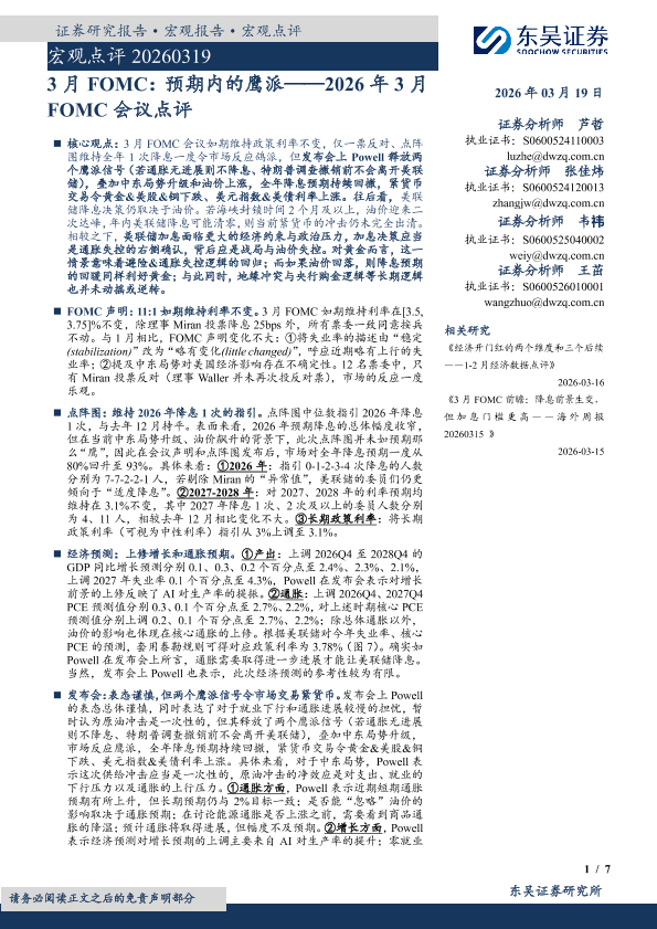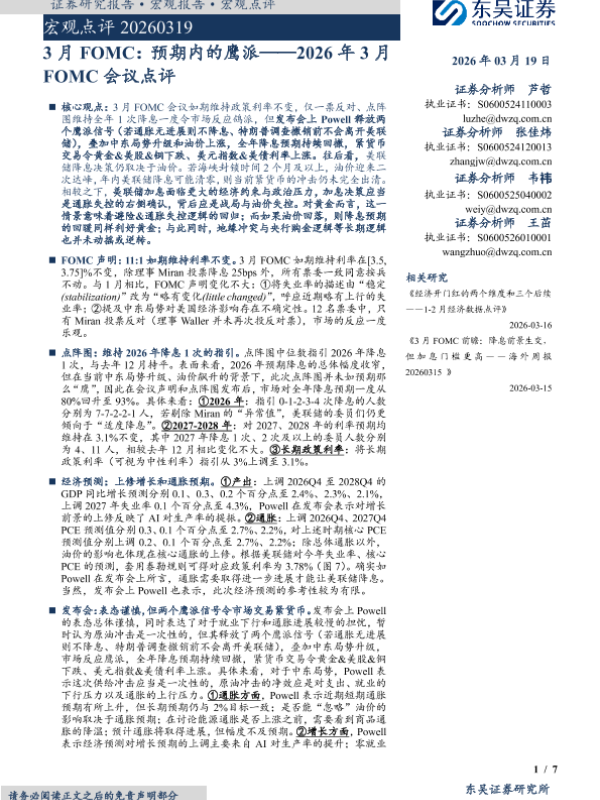 【东吴证券】【202603】2026年 3月 FOMC会议点评:3月 FOMC:预期内的鹰派-7页