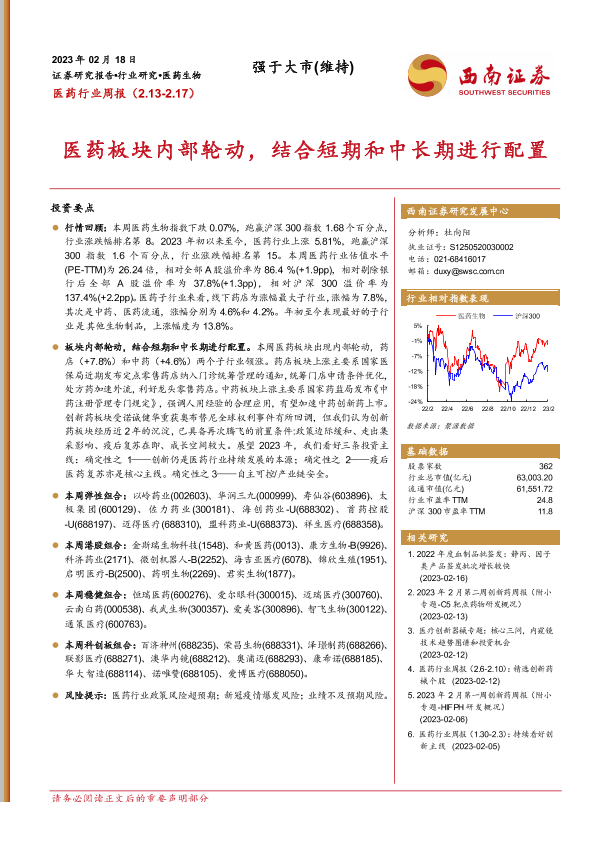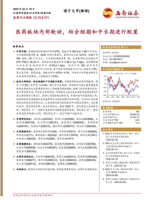 【西南证券】【20230218】医药行业周报:医药板块内部轮动,结合短期和中长期进行配置-34页