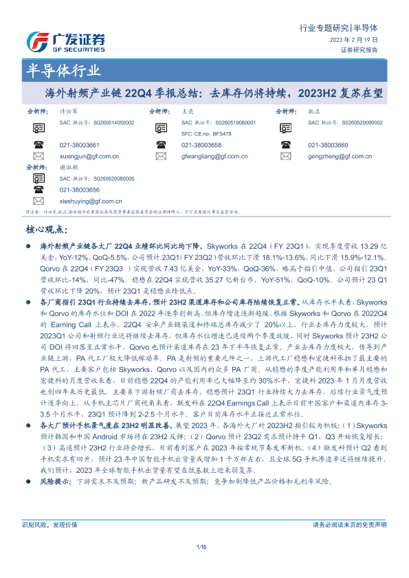 【广发证券】【20230219】半导体行业海外射频产业链22Q4季报总结:去库存仍将持续,2023H2复苏在望-16页