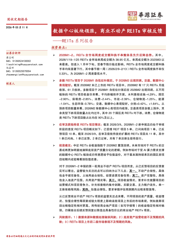 【华源证券】【202603】REITs系列报告——数据中心板块领涨,商业不动产 RE ITs审核反馈-10页