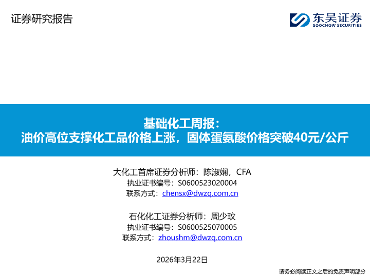 【东吴证券】【202603】基础化工周报:油价高位支撑化工品价格上涨,固体蛋氨酸价格突破40元/公斤-20页