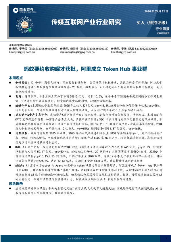 【国金证券】【202603】传媒互联网产业行业研究:蚂蚁要约收购耀才获批,阿里成立Token Hub事业群-12页