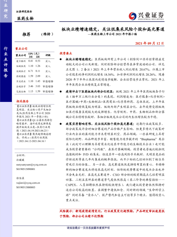 【兴业证券】【20210912】医药生物行业上市公司2021年中报小结:板块业绩增速稳定,关注低集采风险个股和高光赛道-17页