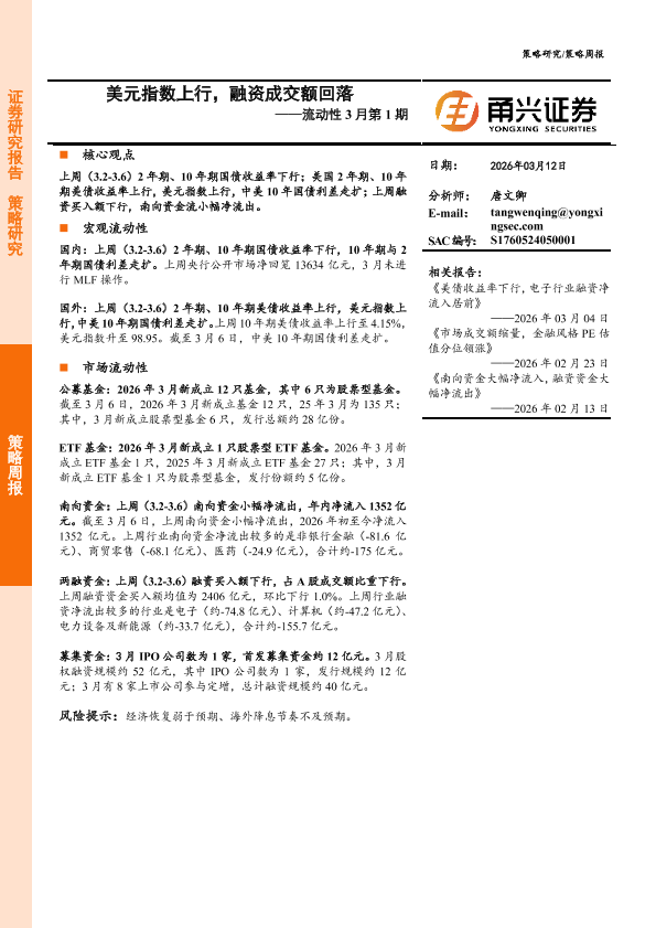 【甬兴证券】【202603】美元指数上行,融资成交额回落——流动性 3月第 1期-10页