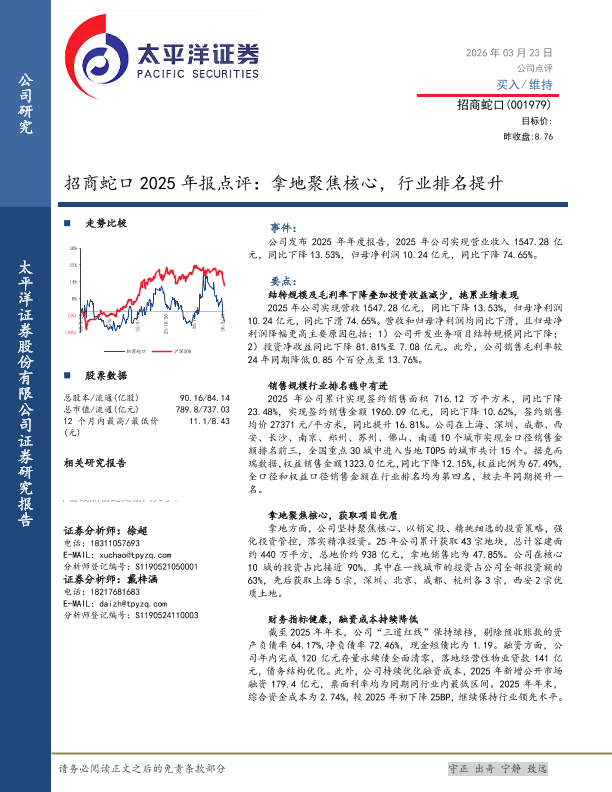 【太平洋证券】【2025】招商蛇口2025年报点评:拿地聚焦核心,行业排名提升-5页