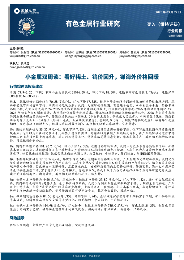 【国金证券】【202603】有色金属行业小金属双周谈:看好稀土、钨价回升,锑海外价格回暖-16页