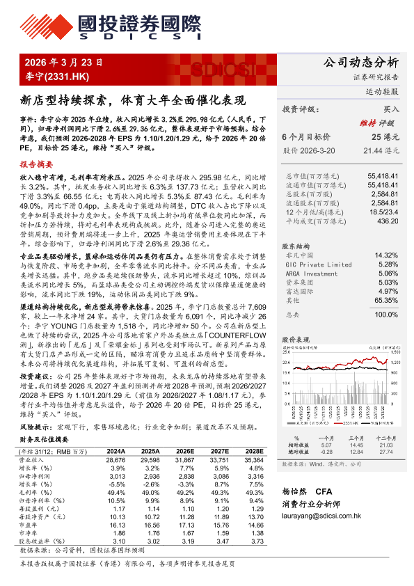 投资评级 体育营销 新店型 盈利预测 李宁