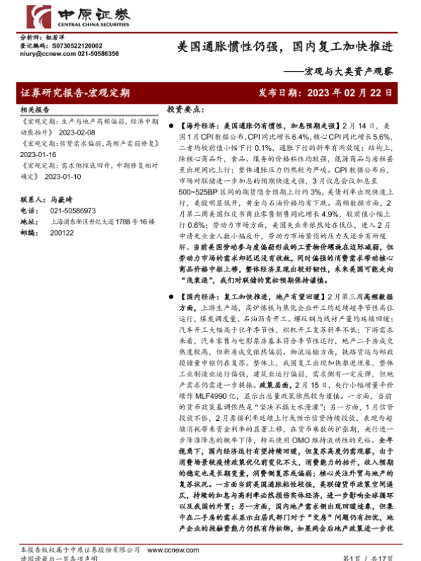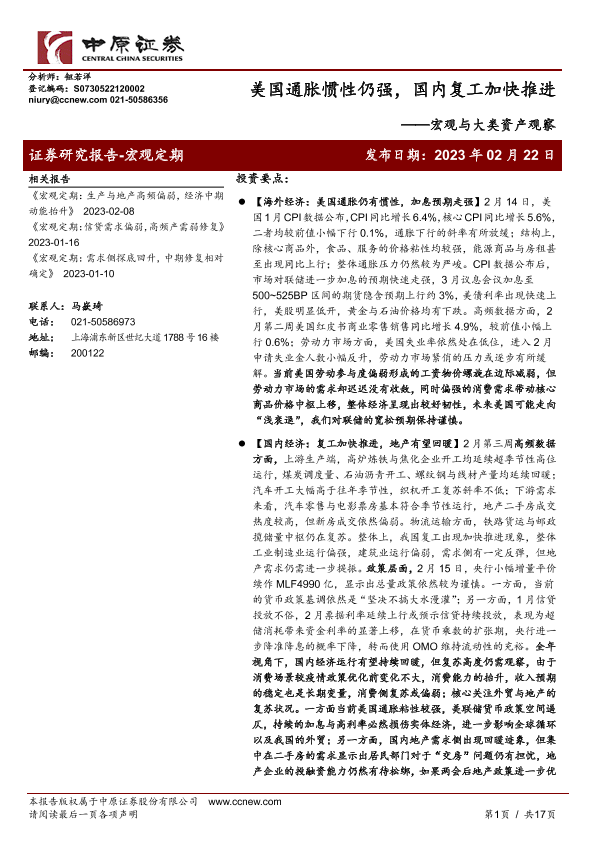 【中原证券】【20230222】宏观与大类资产观察:美国通胀惯性仍强,国内复工加快推进-17页