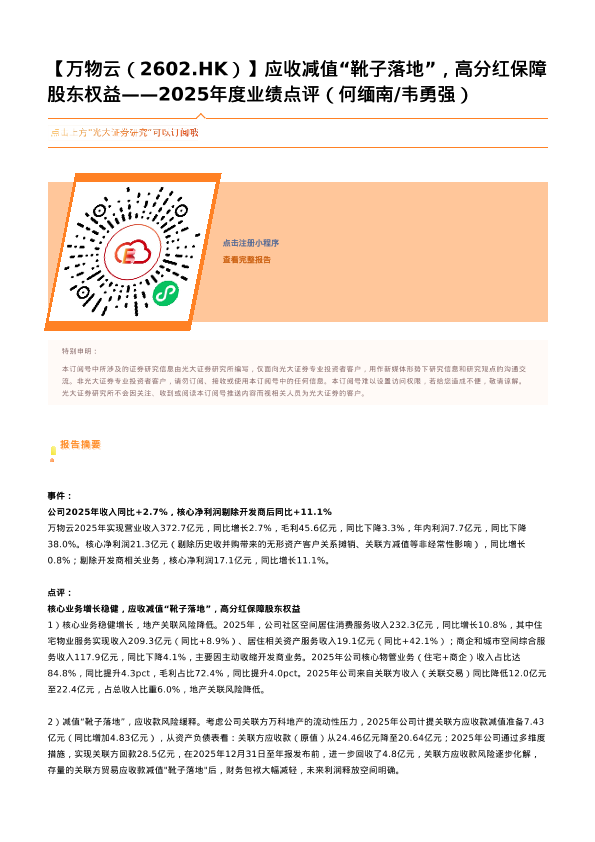 【光大证券】【2026】万物云(2602.HK)】应收减值“靴子落地”,高分红保障 股东权益——2025年度业绩点评-2页