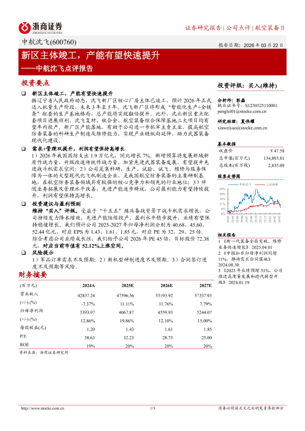 投资评级 国防军工 产能提升 中航沈飞 盈利预测