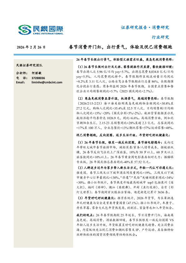 【民银证券】【202602】春节消费开门红,出行景气,体验及悦己消费领跑-8页