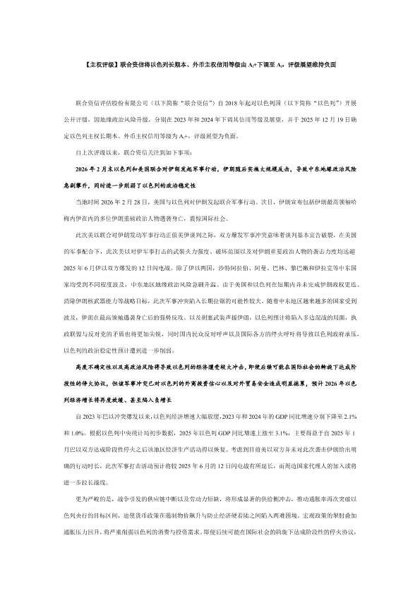 【联合资信】【202512】联合资信将以色列长期本、外币主权信用等级由Ai+下调至Ai,评级展望维持负面-2页
