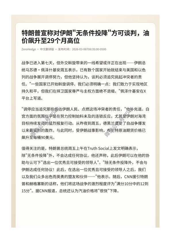 【ZeroHedge】【202603】特朗普宣称对伊朗"无条件投降"方可谈判,油价飙升至29个月高位-6页