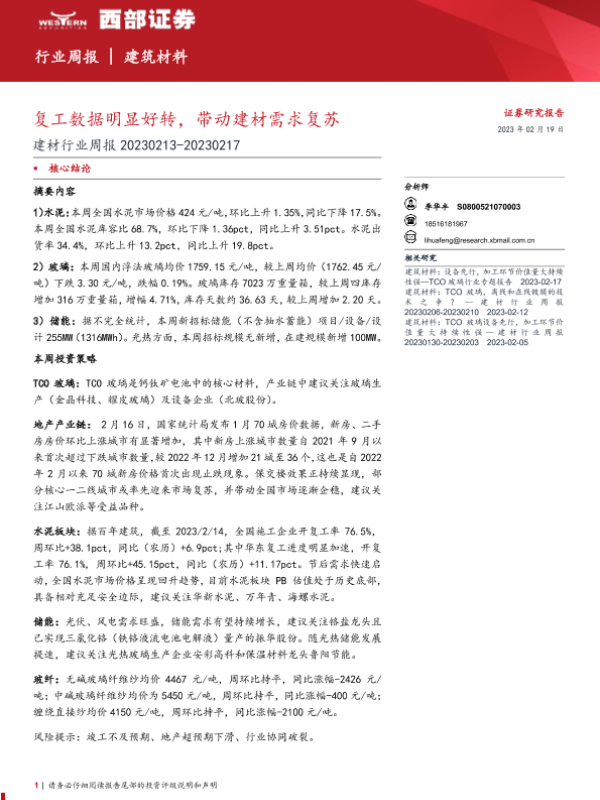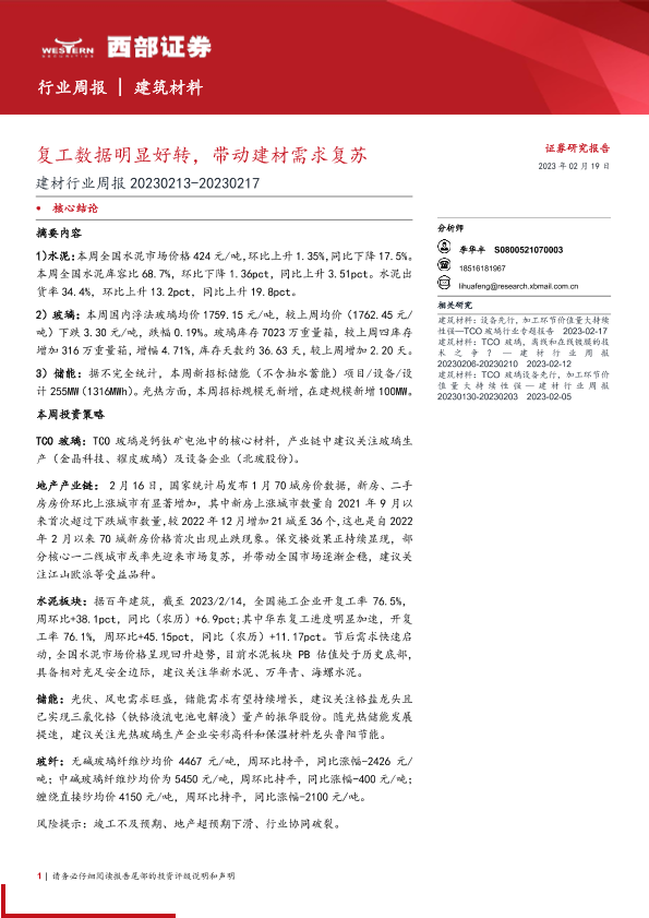 【西部证券】【20230219】建材行业周报:复工数据明显好转,带动建材需求复苏-19页