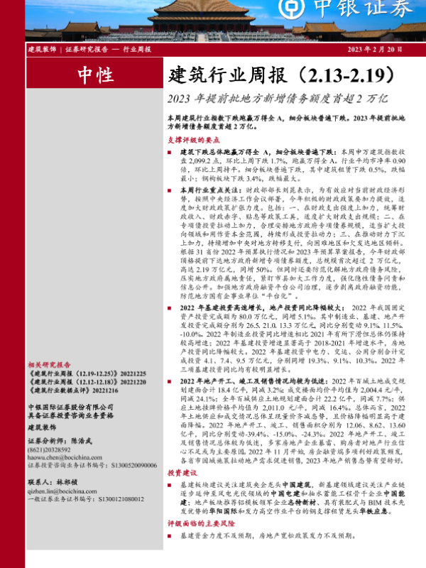 【中银证券】【20230220】建筑行业周报:2023年提前批地方新增债务额度首超2万亿-16页