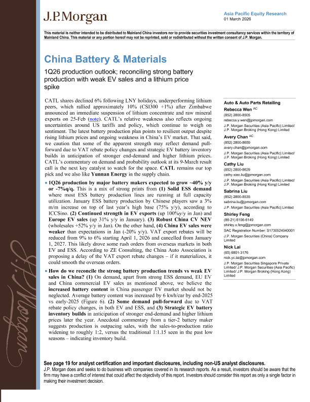 【J.P. Morgan】【202603】China Battery& Materials 1Q26 production outlook; reconciling strong battery production with weak EV sales and a lithium price spike-26页