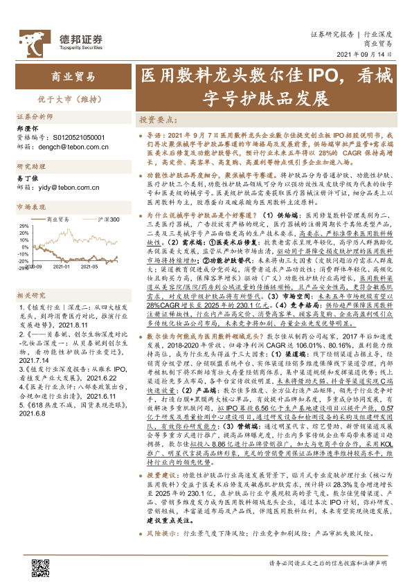 【德邦证券】【20210914】商业贸易行业:医用敷料龙头敷尔佳IPO,看械字号护肤品发展-30页