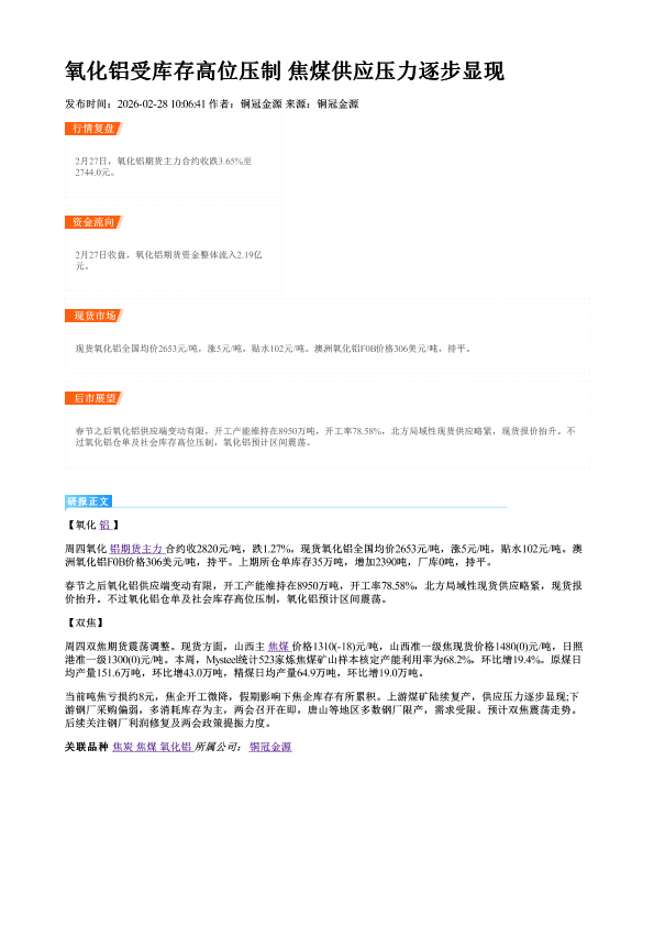 【铜冠金源期货】【202602】氧化铝受库存高位压制 焦煤供应压力逐步显现-1页